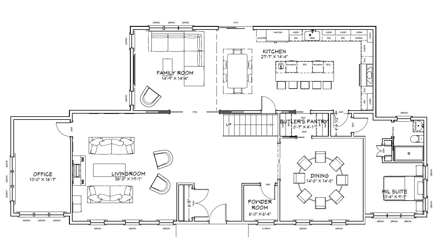Revised first floor: The design creates an open, welcoming feel upon entry, with large pocket doors that offer both openness and privacy as needed. The kitchen now features a large island, adjoining family room, and a butler’s pantry connecting to the dining room. A compact mother-in-law ensuite was added off the kitchen.